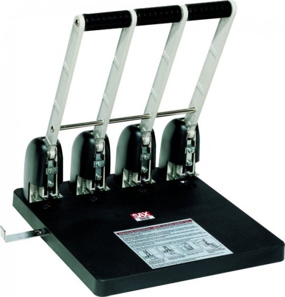 Profesjonalny, metalowy dziurkacz_posiada ogranicznik formatu: SAX908: B6-S/A5-S/B5-S/A3S/A4-S/B5-E/A4-E/B4-E/A3-E; SAX988: B4-S/B3-E/A3-E/A2-E_dziurkuje do 150 kartek_na 2 lub 4 dziurki_średnica dziurki: 5,5mm_odstęp pomiędzy dziurkami: 80mm_wymienne bolce tnące SAX908/1 (1szt.)_wymienne kółka SAX908/2 (4szt.)_podstawa wyposażona w antypoślizgowe elementy_10 lat gwarancji