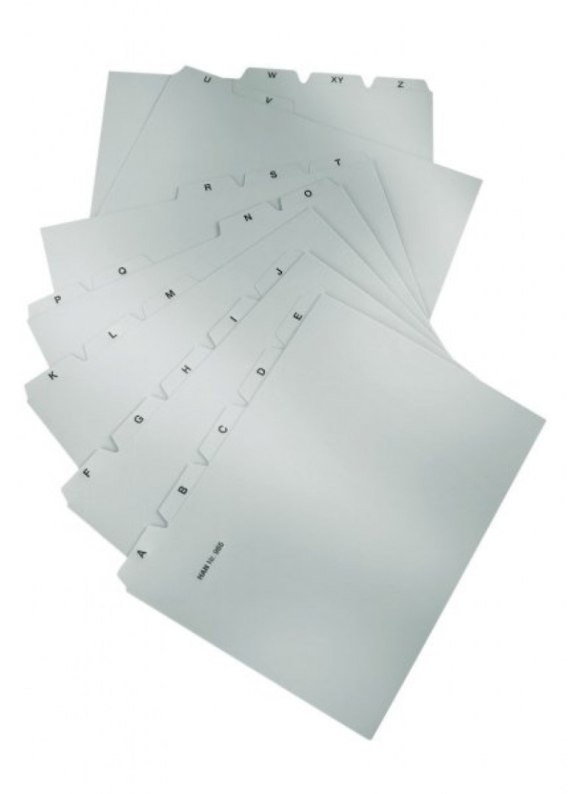 Wykonane z PP, przeznaczone do kartotek A5_do oddzielania kart umieszczonych poziomo_ilość przekładek: 25_indeks: A-Z_kolor szary
