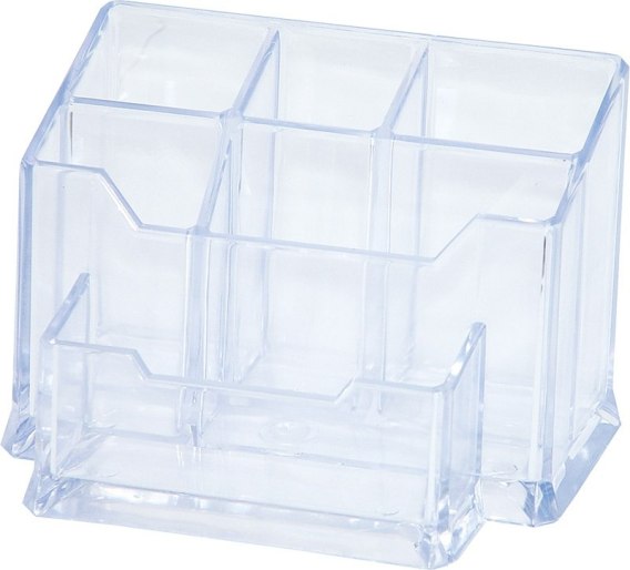 Przybornik na biurko, wykonany z odpornego na pęknięcia polistyrenu_5 przegrody na akcesoria piszące_1 przegroda na karteczki (76x76mm)_wymiary: 155x105x101mm_kolor transparentny