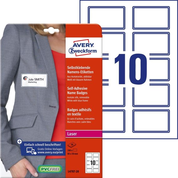 Samoprzylepne identyfikatory 80 _ 50 mm, 20 ark., niebieska ramka, sztuczny jedwab, L4787_20, Avery Zweckform