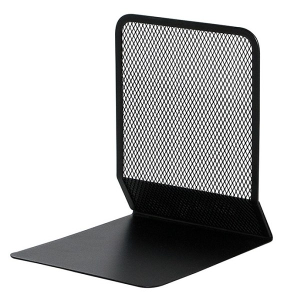 Stojak na książki w dwóch wariantach_wyprodukowany z metalowej siateczki powlekanej lakierem_w kształcie litery _L__z gładkimi krawędziami i zaokrąglonymi narożnikami_na podstawie antyposlizgowe podkładki_wymiary: 130x155x165mm_2 sztuki w j.s._kolor czarny