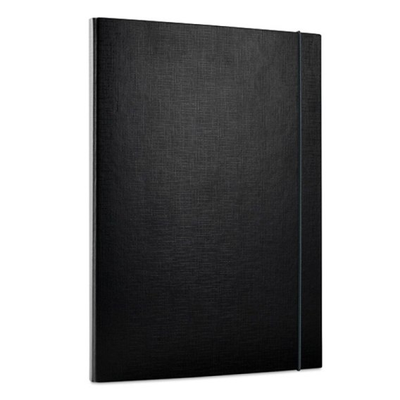Teczka poszerzana, 3-skrzydłowa_wykonana z utwardzanego kartonu_pokryta ekologiczną folią PP o grubości 100 mikronów_wewnątrz biała okleina o gramaturze 115g/m2_pojemność: ok. 120 kartek o gramaturze 80gsm_zamykana okrągłą gumką wzdłuż teczki_gramatura tektury: 950g/m2_grubość tektury 1,5mm_szerokość grzbietu: 15mm_format: A4_kolor: czarny