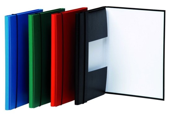 Wykonana z utwardzanego kartonu (1,8mm)_pokryta ekologiczną folią PP o grubości 100_m_wewnątrz biała okleina o gramaturze: 100g/m__zamykana czarną gumką_posiada 3 boczne skrzydła_pojemność: ok. 120 kartek o gramaturze 80g/m_