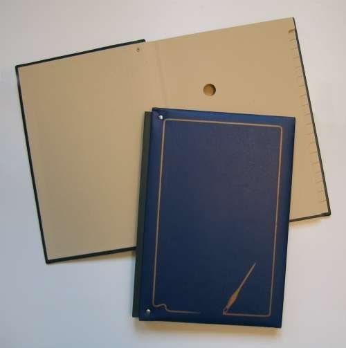 Okładka twarda, oprawiona w okleinę powleczoną PVC, z gąbką. Grzbiet harmonijka. Łączenie okładki z blokiem wzmocnione nitami. Blok z kartonu barwionego. Zawiera 20 kart z 2 otworami i korytarzem bocznym