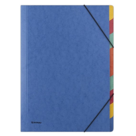 Wykonana z kartonu typu preszpan o gramaturze 500gsm_posiada Zielony Punkt (Der Gr_ne Punkt) - udział w systemie recyklingu i odzysku odpadów wynikający z przepisów prawa polskiego i UE_9 kolorowych przekładek ułatwia segregowanie dokumentów_możliwość opisania indeksów_zamykana na dwie narożne, okrągłe gumki chroniące zawartość przed wysunięciem_format: A4_rozmiar: 260x343mm_kolor niebieski