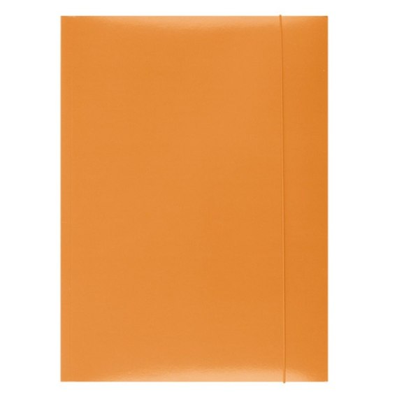 Wykonana z kartonu o gramaturze 300gsm_3-skrzydłowa_pokryta lakierem drukarskim o wysokim połysku_okrągła, pionowa gumka w kolorze teczki chroni zawartość przed wysunięciem_format: A4_rozmiar: 232x320mm_kolor pomarańczowy
