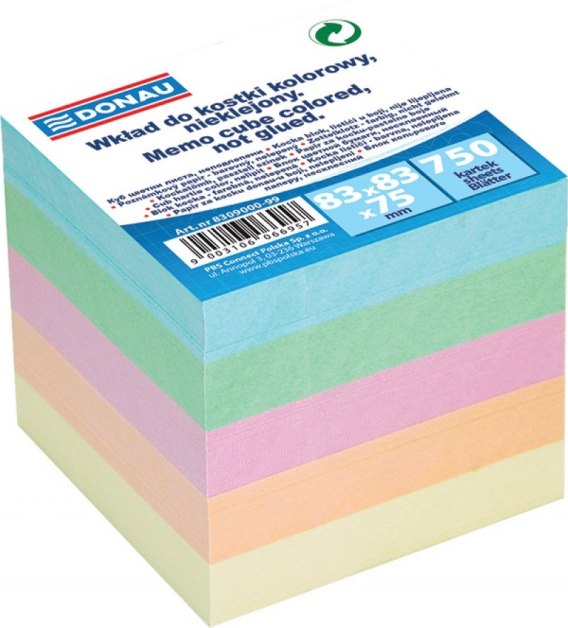 Kostka, karteczki nieklejone_rozmiar karteczki: 83x83mm_wysokość kostki: 75mm_gramatura: 70g - 80g_do wykorzystania jako samodzielny bloczek lub uzupełnienie pojemnika_foliowana jednostka sprzedaży_mix kolorów (kolory karteczek mogą się różnić od tych predstawionych na zdjęciu)