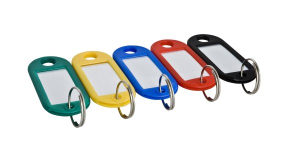 Plastikowe zawieszki do kluczy, posiadają zabezpieczone przezroczystą folią okienko do wpisania numeru pomieszczenia