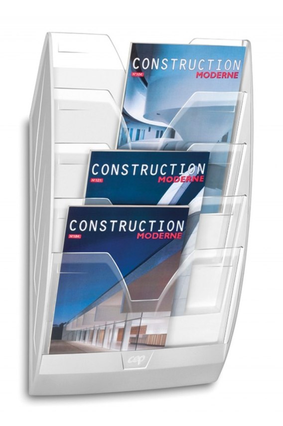Stylowy zestaw 5 półek przeznaczony na dokumenty w formacie A4, wykonany z odpornego na pęknięcia i odkształcenia polistyrenu w 100% nadającego się do recyklingu_wewnątrz mieści kartki lub wydruki o maksymalnym rozmiarze 24x32cm_duży kąt ułatwia wkładanie i wyjmowanie dokumentów_opcja łączenia zestawów w pionie lub poziomie_mocowany za pomocą dwóch śrub - akcesoria do prostego i szybkiego montażu w komplecie_pojemność jednego przedziału: 325x26mm_wymiary: 580x122x350mm_kolor przeźroczysty